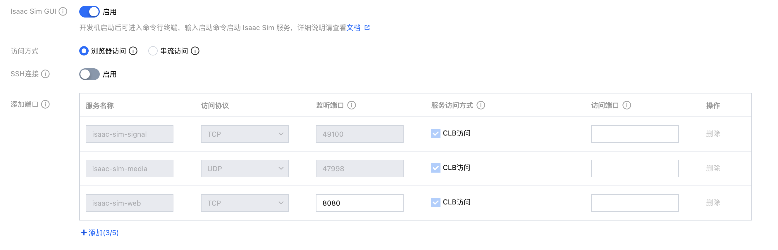 服务名称:isaac-sim-signal;访问协议:TCP;监听端口:默认49100,不可修改;服务访问方式:CLB 访问;访问端口:49100,不可修改