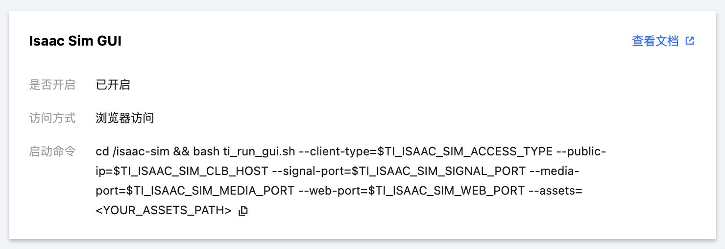 3. 完成创建后,即可在开发机/任务式建模的详情页查看对应的 Isaac Sim GUI 服务的启动命令,如下图所示,实际使用的时候,您只需要将