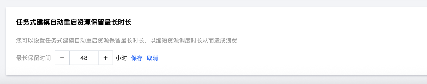 您可以设置任务式建模自动重启资源保留最长时长,以避免资源过长时间预留而造成浪费。在此处设置的时长控制了用户在创建任务时配置的重启资源保留时长的上限,例如管理员在此处配置了48小时,则用户在创建任务时配置的重启资源保留时长时,最大可配置48小时。