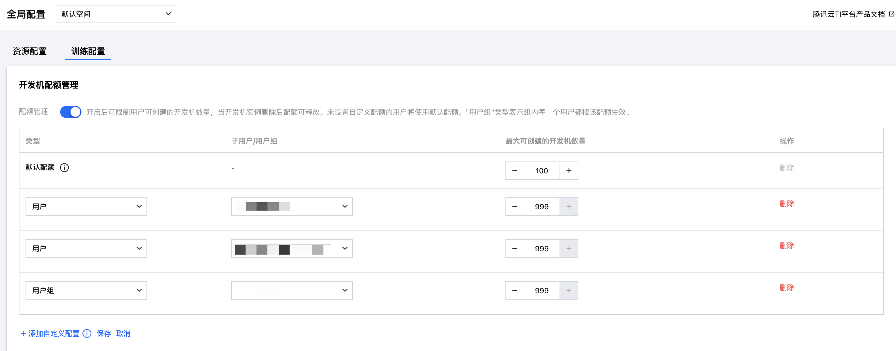 开启配额管理按钮后,可限制用户在当前空间下可创建的开发机数量,当开发机实例删除后配额可释放。未配置自定义配额的用户将使用默认配额。“用户组”类型表示组内每一个用户都按该配额生效。