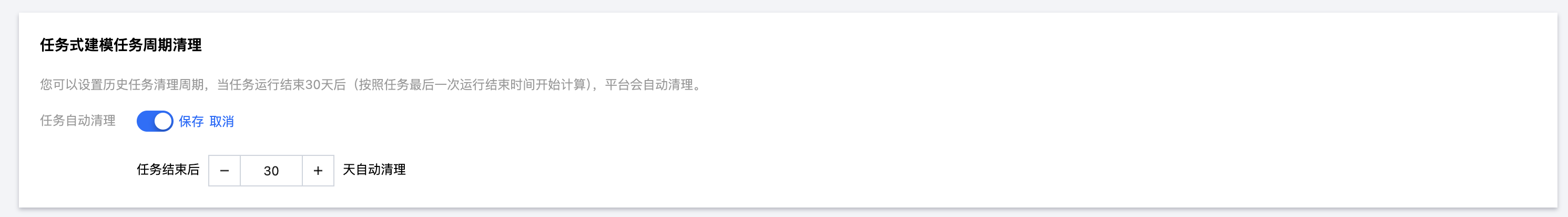 您可以设置历史任务清理周期,当任务运行结束<您配置的天数>后(按照任务最后一次运行结束时间开始计算),平台会自动清理。默认配置为30天,您可以修改该配置。