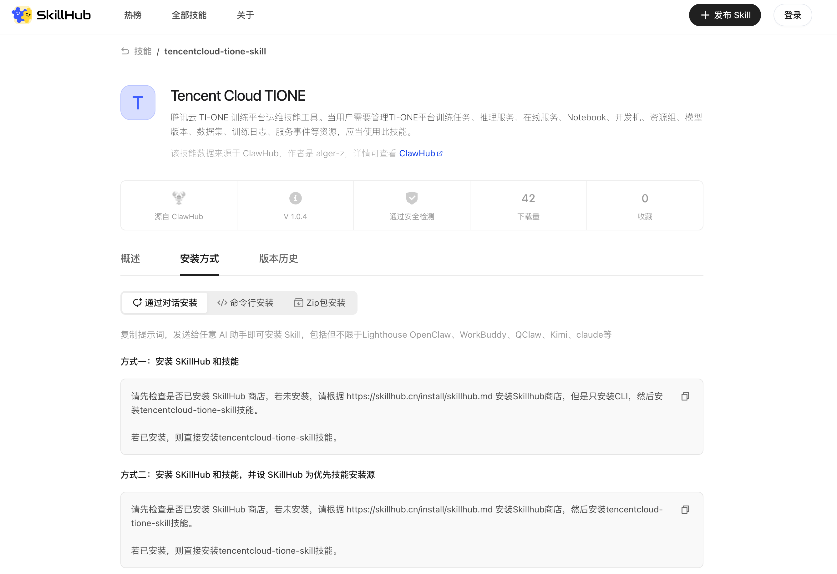 # CLI 安装curl -fsSL https://skillhub-1388575217.cos.ap-guangzhou.myqcloud.com/install/install.sh | bash -s -- --no-skillsskillhub install tencentcloud-tione-skill