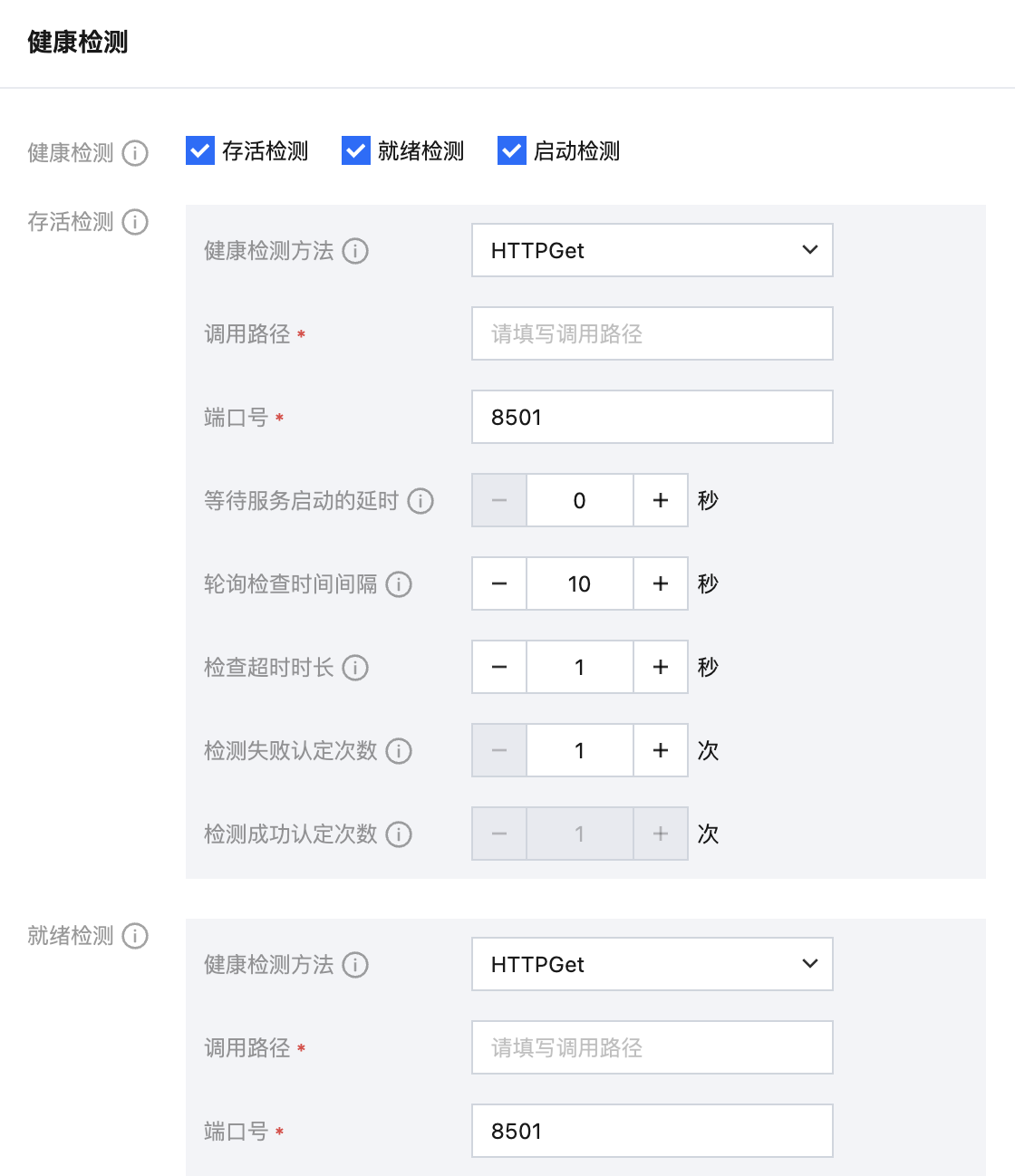 等待服务启动的延时 | 容器启动后,等待多久开始第一次检测。请根据应用启动时间设置,避免因应用尚未启动而误判 | 如:30-60秒,给应用足够的启动时间,避免误判 |