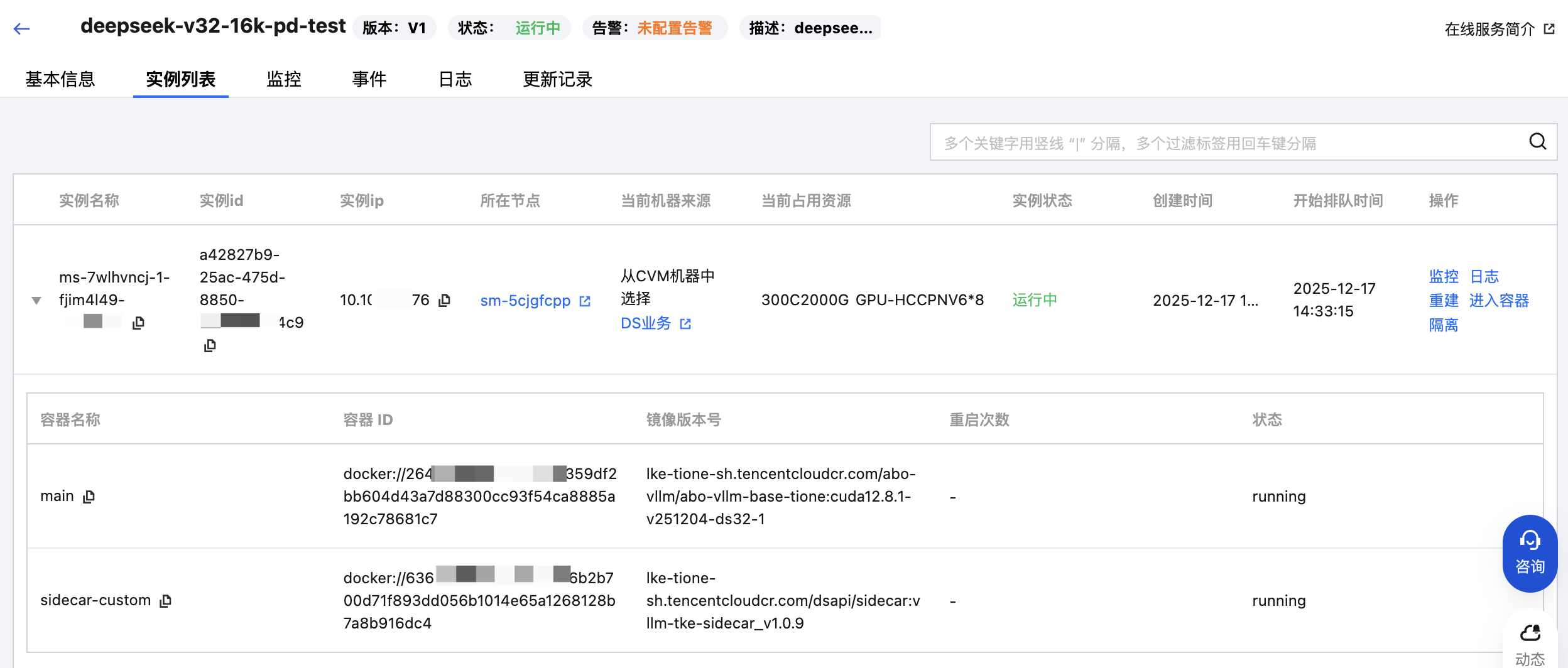 进入在线服务详情页,查看“实例列表”Tab页面。每个实例会显示其当前状态(运行中、就绪中等)。如果实例因为健康检测失败而重启,您可以看到容器的重启次数和状态变化。