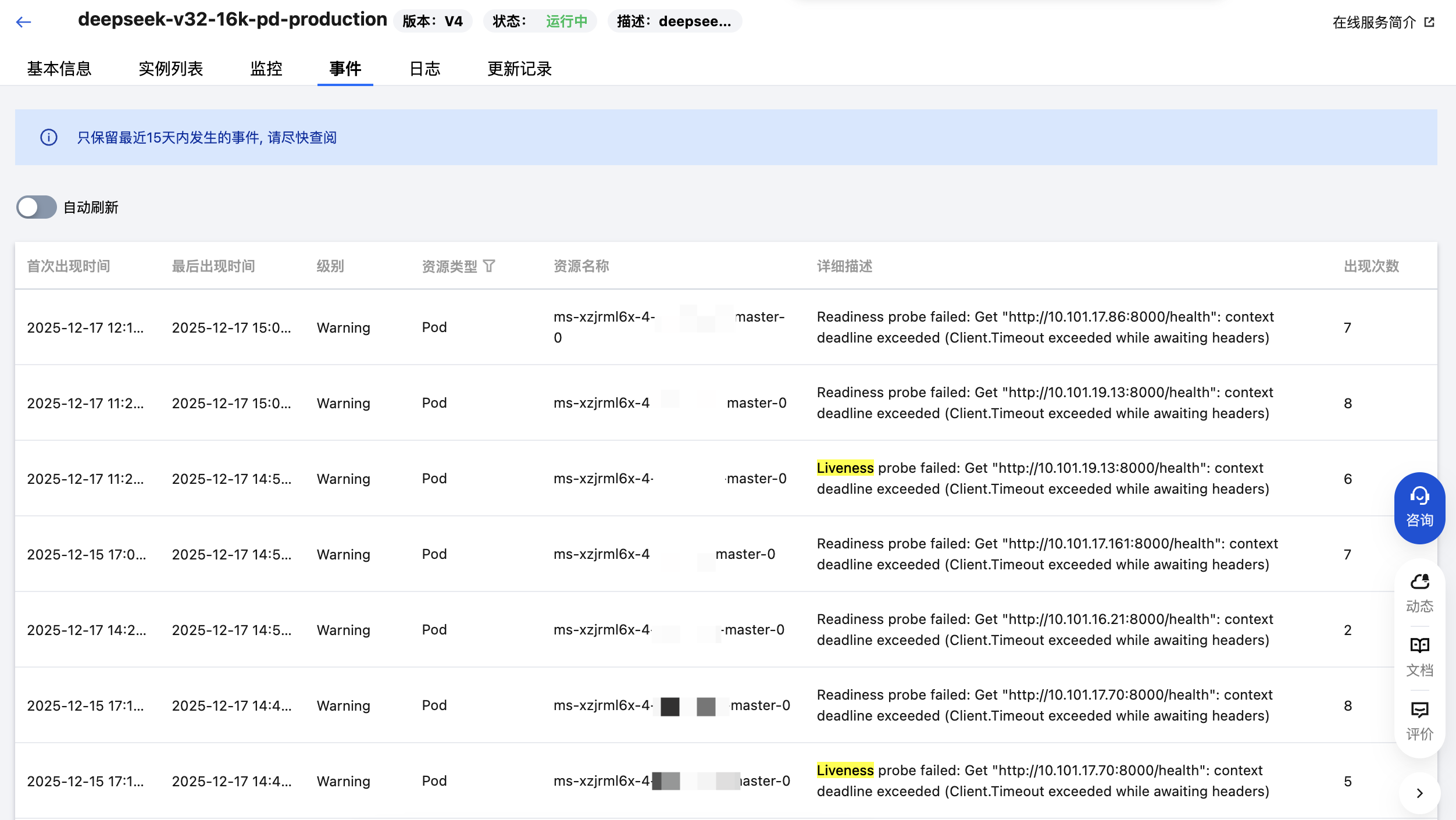 进入在线服务详情页,查看“事件”Tab页面。平台会记录健康检测失败、容器重启等事件。您可以在这里看到具体的失败原因,例如“Liveness probe failed”或“Readiness probe failed”。
