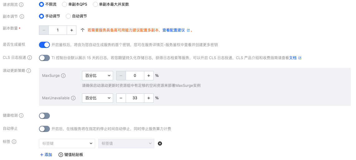 请求限流 | 支持配置服务限流值: 不限流默认单个服务最大的 QPS 为500,限流值大于500时,按照500进行限流,当购买服务升级包后,服务的总限流值以购买升级包的上限为准。 单副本 QPS 的限流值为单个实例的限流。 单副本最大并发数为单个实例的限流。 注意: 该限流值为单个副本的限流,当服务进行扩缩容时,服务整体限流值将按照设置的值 * 副本数进行更新;单个服务组最大的 QPS 为500,当服务组下设置的服务总限流值大于500时,按照500进行限流。 |