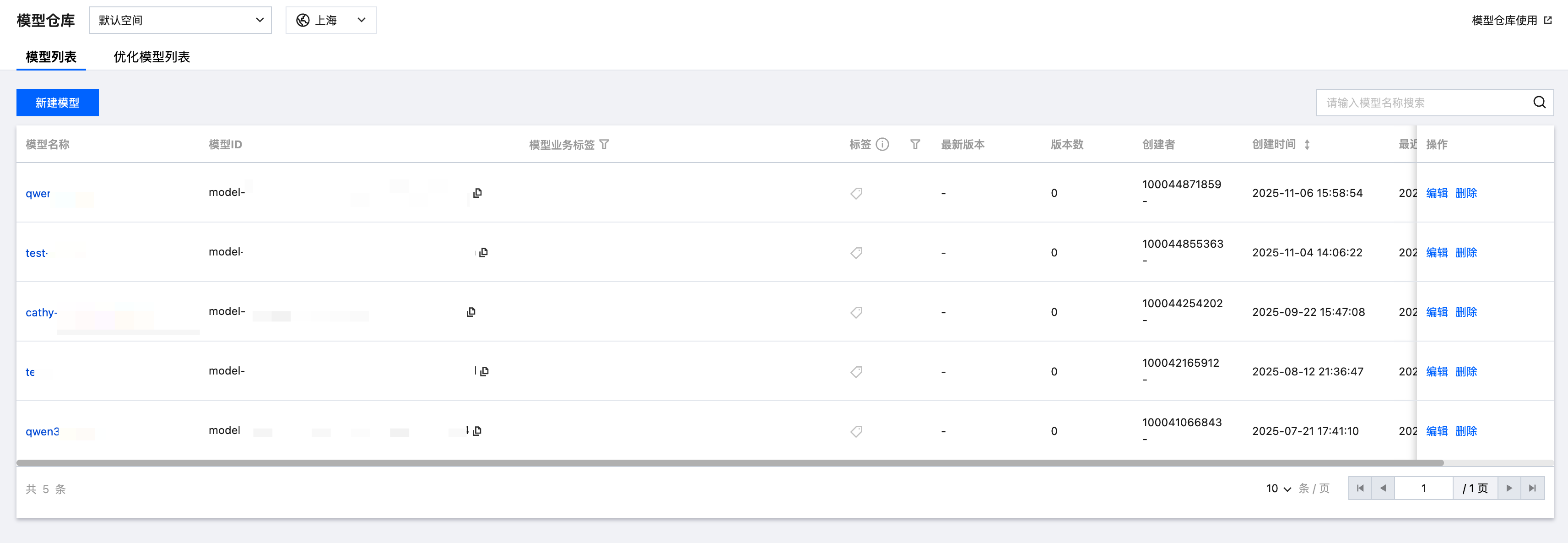 删除版本:单击某个模型名称进入详情页面,在版本列表中选择某个版本,单击删除后经过二次确认将删除该模型版本。若当前版本是该模型的最后一个版本,删除后将删除该模型。