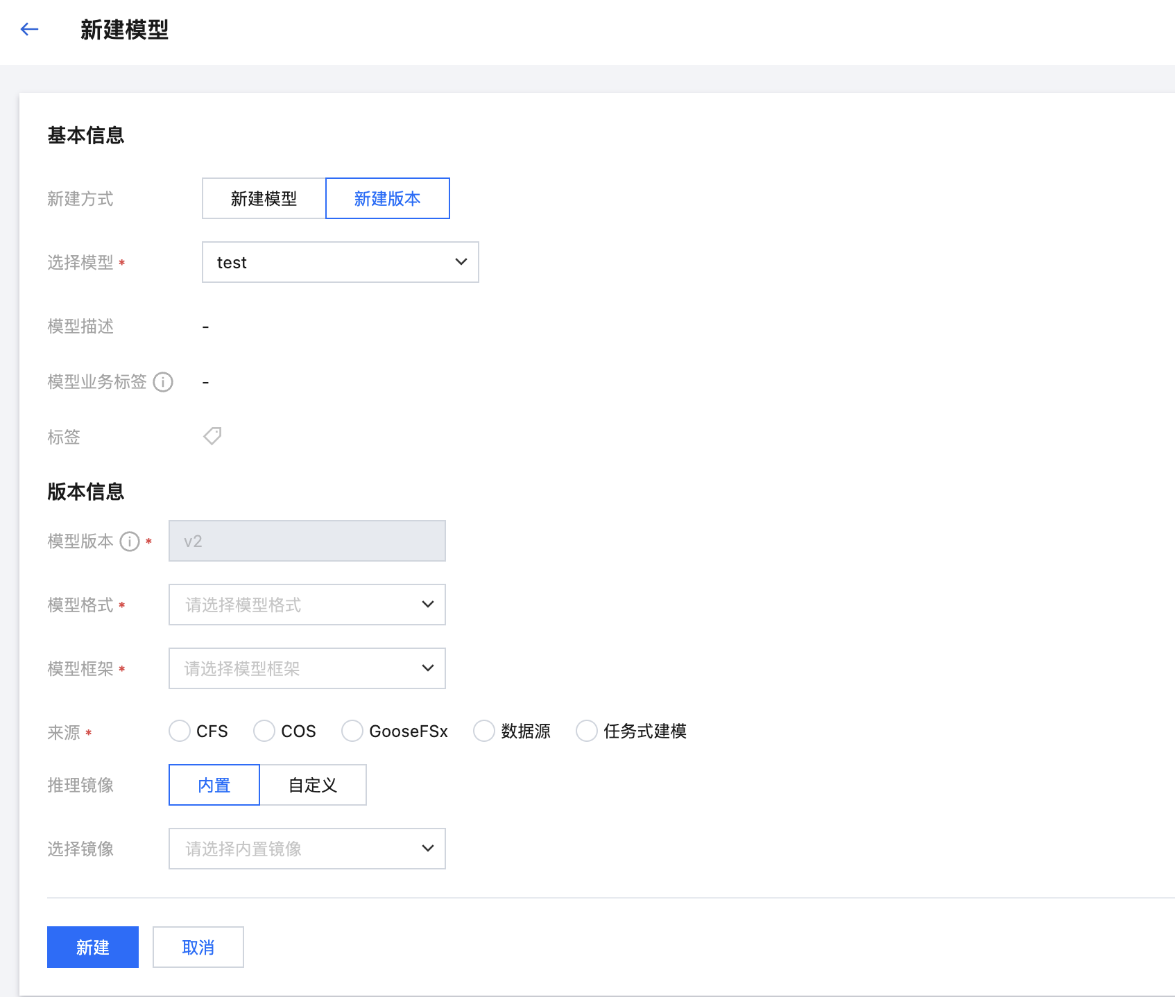 1. 进入模型仓库页面,单击新建模型,新建方式选择新建版本。
