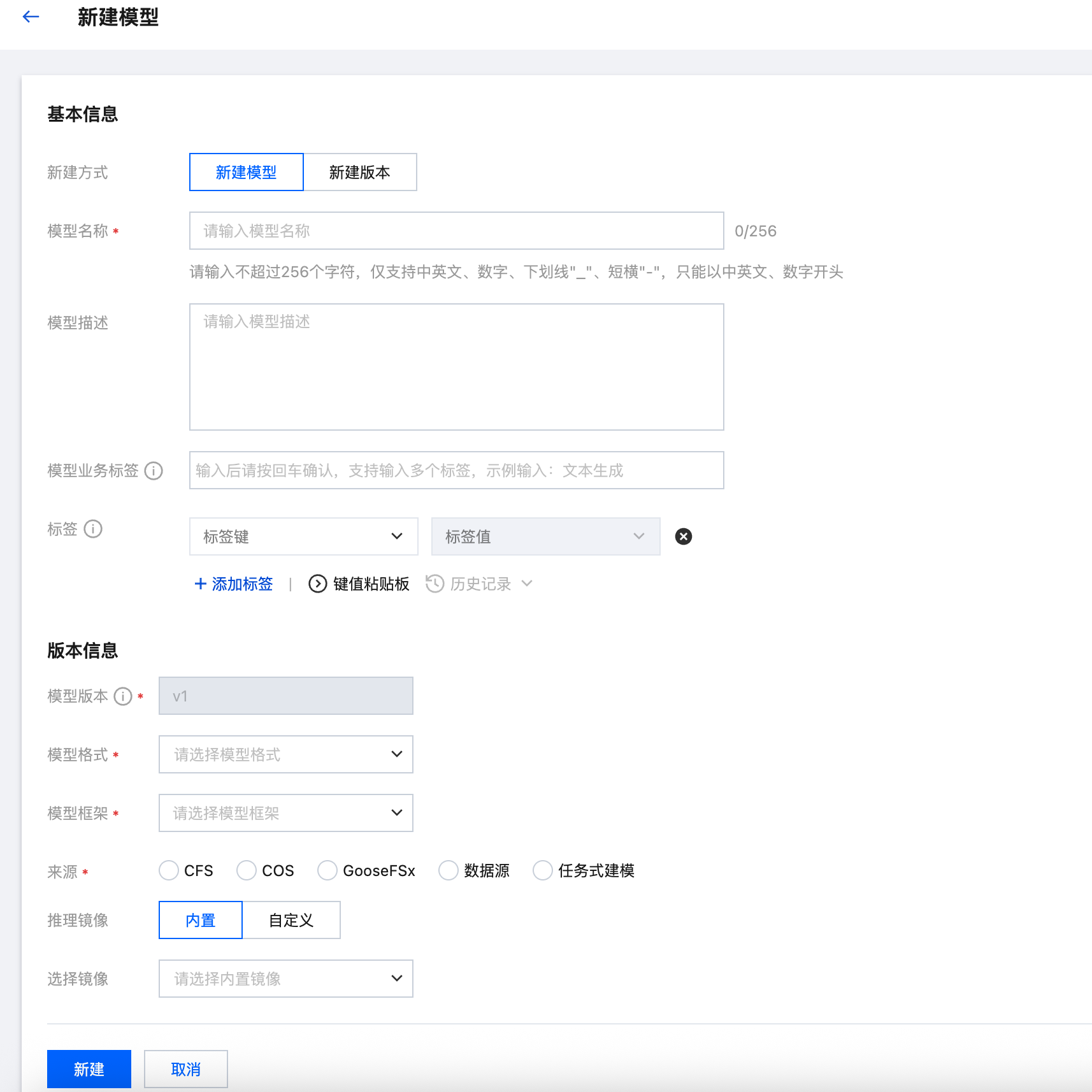 进入模型管理 > 模型仓库,单击新建模型 按钮,开始新建模型/新建版本。