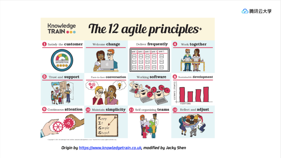 同时也给大家分享敏捷开发的十二条原则,对照这张可视化表为大家快速讲解一下: