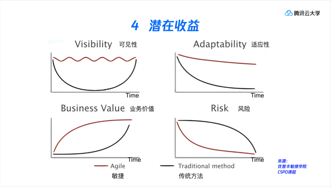 接下来我们看几张图,红色线条指敏捷方法,黑色线条是传统方法,为了方便理解,我们用身边的例子,比如回转寿司和普通点菜吃饭的体验对比来说明一下。比如可见性,回转寿司与普通的根据菜单来点菜不同,菜单可能有欺诈性,而回转寿司就像是一个持续可见的可视流,所见即所得。适应性就是说这道寿司不好吃,那我就马上换一盘做调整,那么继续吃继续调整的话总会得到更好的用户体验。而说到业务价值,回转寿司的话你会先拿最想吃的那盘,那么在最短时间就可以获得最高的业务价值。关于风险,比如说我不知道这家回转寿司的口味,那么我坐下来吃两盘觉得味道不对,那我就可以及时止损买单走人,但是在普通的餐厅吃饭,点了九菜一汤,结果第一口就觉得太辣了吃不习惯,退菜重做也不行。刚刚是从用户的角度来说,那么从业主及厨子(开发人员)角度说,他是能直观看到顾客喜爱吃哪种,及时对菜品的增减作出调整,和用户共创一个良好的体验。