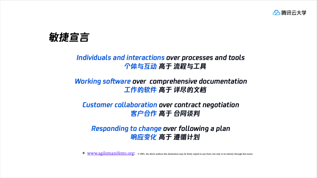 这里的敏捷宣言就是一个总结,可能一些同学和软件研发领域不直接相关,那么把“工作的软件”替换为“工作成果”也是共通的。从敏捷宣言可以看出左边蓝色的描述即为我们需要关注的核心,是价值观的体现,而右边部分是被“高于”而不是被“排除”,做好右侧事项可以给我们左侧的目标提供更好的支持,右边需要持续改进。