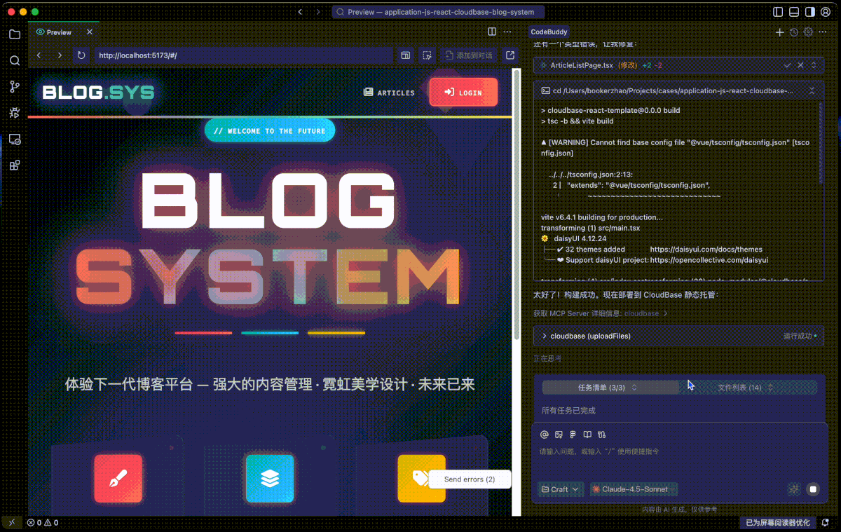将 AI 编程工具(CodeBuddy、Cursor、Claude Code等)与 CloudBase MCP 进行结合,为你的 AI IDE 赋予强大的开发能力。